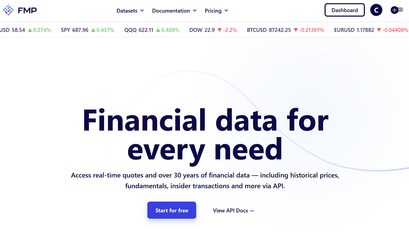 Financial Modeling Prep (FMP): A broad, all-in-one API that combines market prices with fundamentals and additional datasets for building complete financial applications.