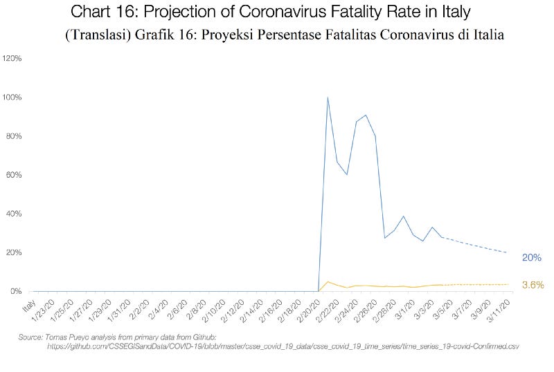 Hal ini yang kamu lihat di data. Persentase fatalitas Cina pada saat artikel ini diterbitkan adalah antara 3.6% dan 6.1%. Bila kita memproyeksikan kedepannya, sepertinya mereka bertemu diantara perkiraan 3.8%–4%. Ini berarti dua kali lebih besar dari perkiraan sekarang, dan 30 kali lebih buruk dibandingkan flu.