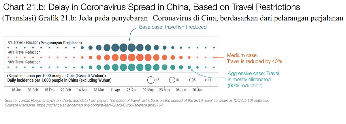 Grafik diatas menunjukan imbas dari pelarangan perjalanan oleh Wuhan kepada penundaan epidemik. Ukuran lingkaran menunjukkan angka kasus per harinya. Baris diatas menunjukkan jika tidak ada tindakan apapun. Kedua baris yang lain menunjukkan jika 40% dan 90% perjalanan dilarang. Model ini dibuar oleh ahli epidemik, karena kita tidak bisa yakin sepenuhnya.